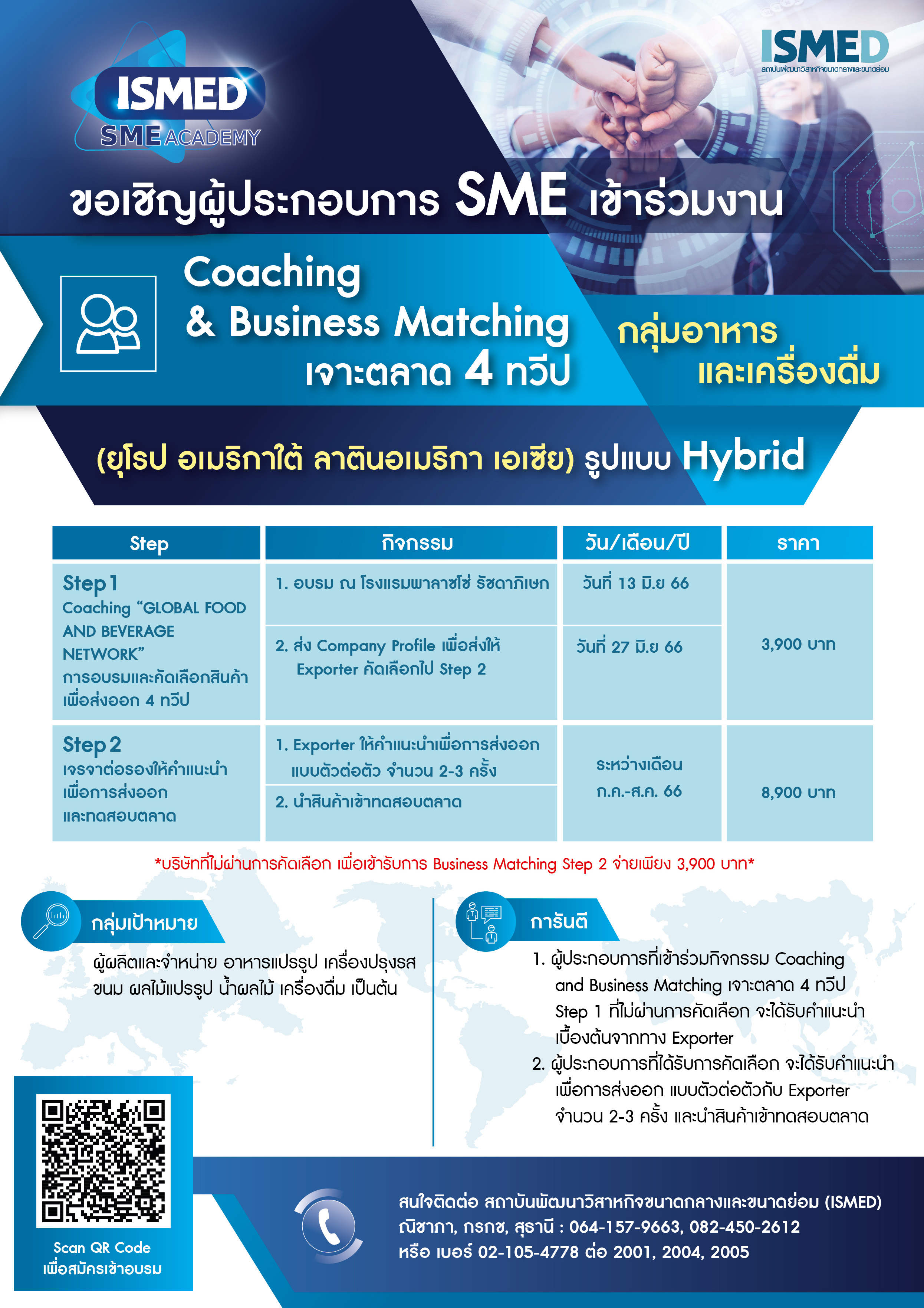 หมายเหตุ : ผู้สมัคร Online Coaching and Business Matching เจาะตลาด 4 ทวีป กลุ่มอาหารและเครื่องดื่ม ทุกท่าน จะได้รับการพิจารณาคัดกรองจาก Company Profile (ส่งได้ไม่เกิน 27 มิถุนายน 2566) หากสินค้าได้รับการพิจารณาคัดกรองแล้วผ่าน ผู้สมัครจะได้เข้ารับการเจรจาธุรกิจ Business Matching Step#2 ซึ่งเจ้าหน้าที่จะแจ้งผลการคัดกรองและกำหนดการให้ทราบ (โดยจะอยู่ในระหว่าง กรกฎาคม – สิงหาคม)  ค่าใช้จ่าย Step#2 = 8,900 บ.