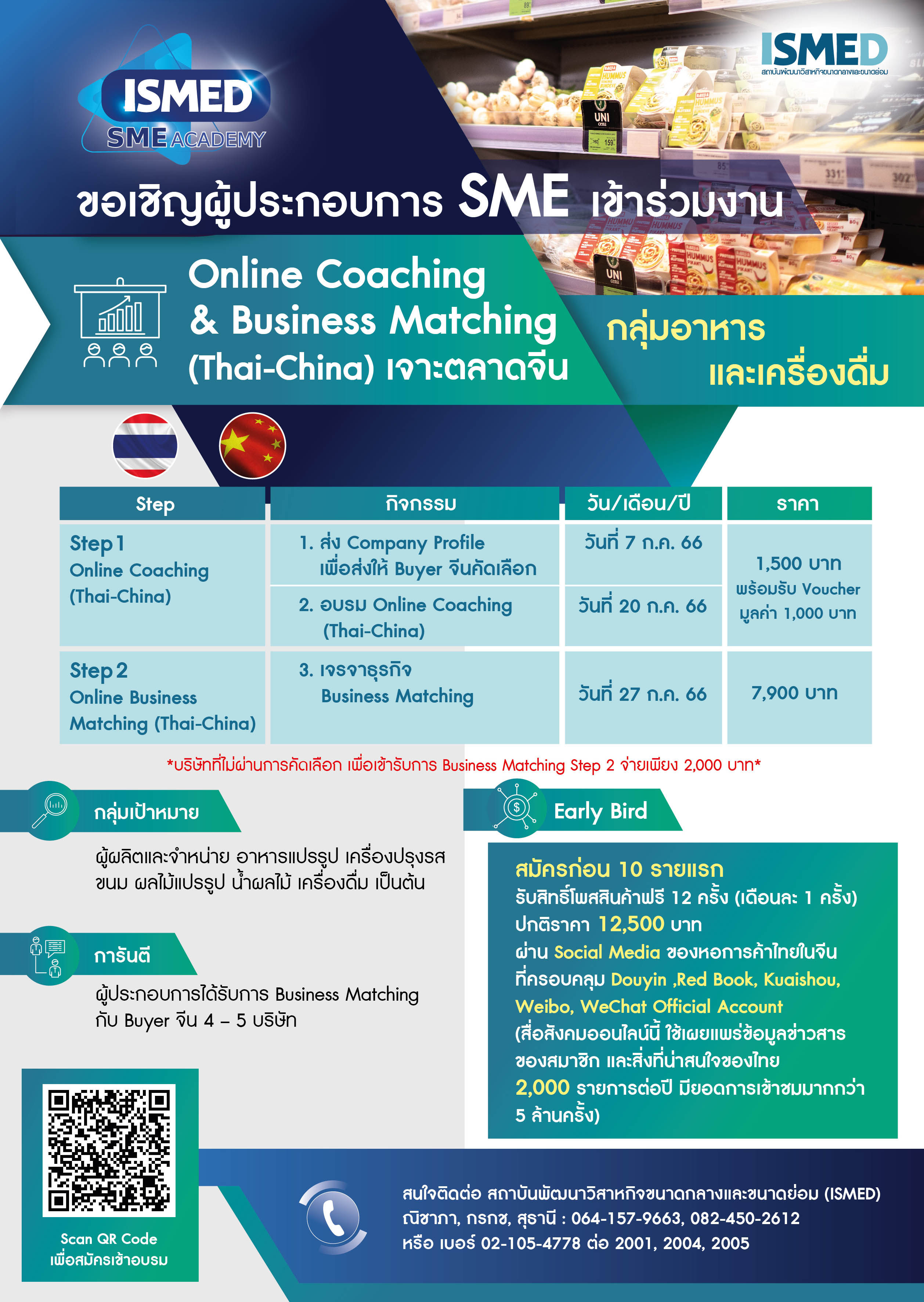 ผู้สมัครที่แล้ว : จะได้รับการติดต่อจากเจ้าหน้าที่ ISMED ให้ผู้สมัครจัดทำและส่ง Company Profile ภายในวันที่ 7 กรกฎาคม 2566 เพื่อทำการคัดกรอง โดยหากผ่านการคัดกรองจะได้เข้าร่วมกิจกรรมในถัดไป Step#2 Business Matching ซึ่งเจ้าหน้าที่จะแจ้งผลการคัดกรองและกำหนดการให้ทราบ (โดยจะอยู่ในระหว่าง กรกฎาคม – สิงหาคม) ค่าใช้จ่าย Step#2 = 7,900 บ. และหากไม่ผ่านการคัดกรอง จะได้รับคำแนะนำเบื้องต้น นำกลับไปพัฒนาสินค้าเจาะตลาดจีนต่อไป