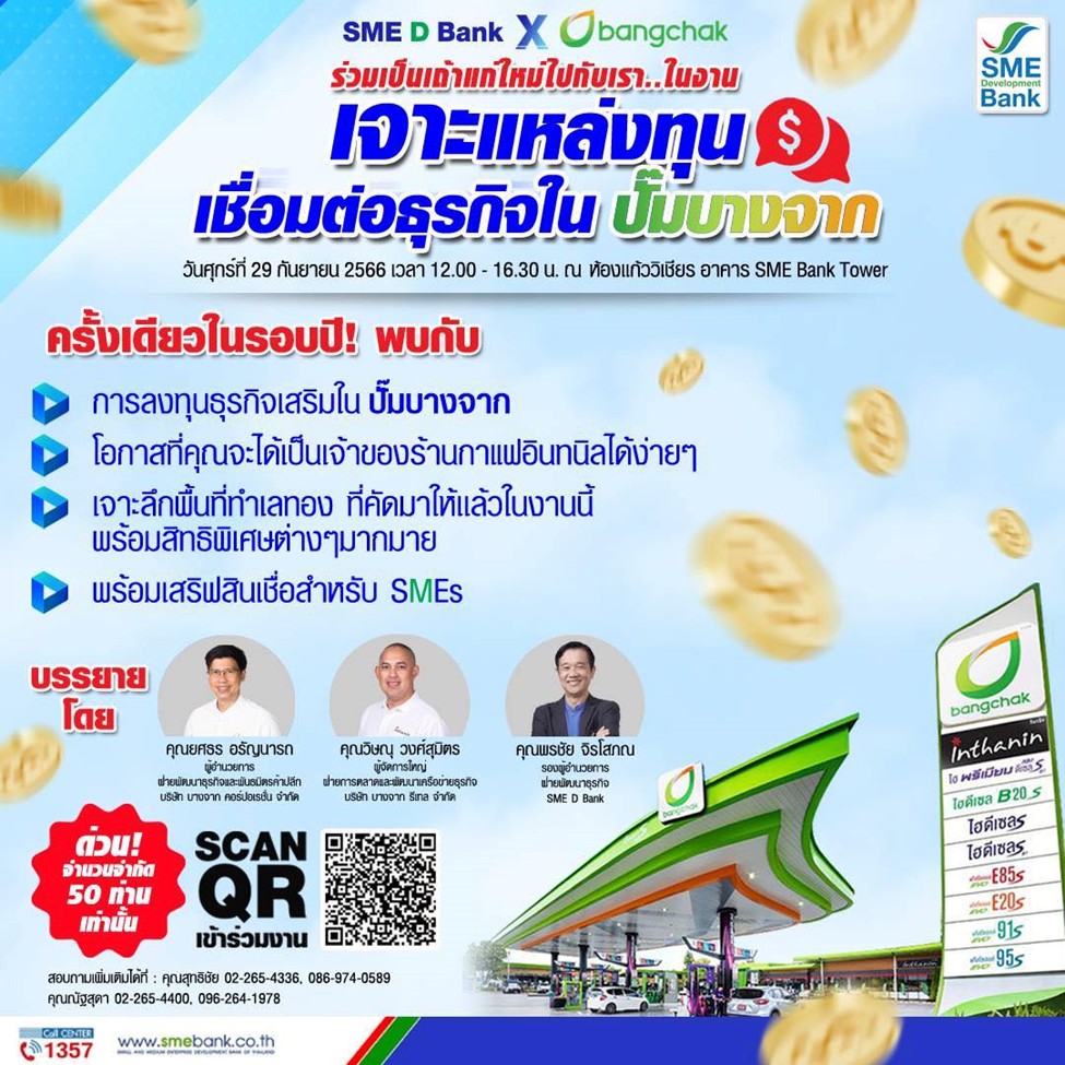 ธนาคารพัฒนาวิสาหกิจขนาดกลางและขนาดย่อมแห่งประเทศไทย  หรือ  SME D Bank ร่วมกับ บางจาก จัดงาน “เจาะแหล่งทุนเชื่อมต่อธุรกิจในปั๊มบางจาก” เป็นการอบรมชี้ช่องทางให้กับว่าที่เถ้าแก่หน้าใหม่ ที่สนใจทำธุรกิจในปั๊มน้ำมันบางจาก พิเศษสำหรับ 50 คนจะได้รับการอบรมฟรี 1ปีมีครั้งเดียว ว่าที่เถ้าแก่หน้าใหม่จะได้รับฟังแนวคิดดี ๆ เกี่ยวกับการลงทุน และโอกาสเป็นเจ้าของร้านกาแฟอินทนิลในปั๊มน้ำมันบางจาก ทำเลทองที่ไหนจะโกยเงิน กับสิทธิพิเศษอีกมากมาย ฯลฯ จากผู้บริหารระดับสูง อาทิ