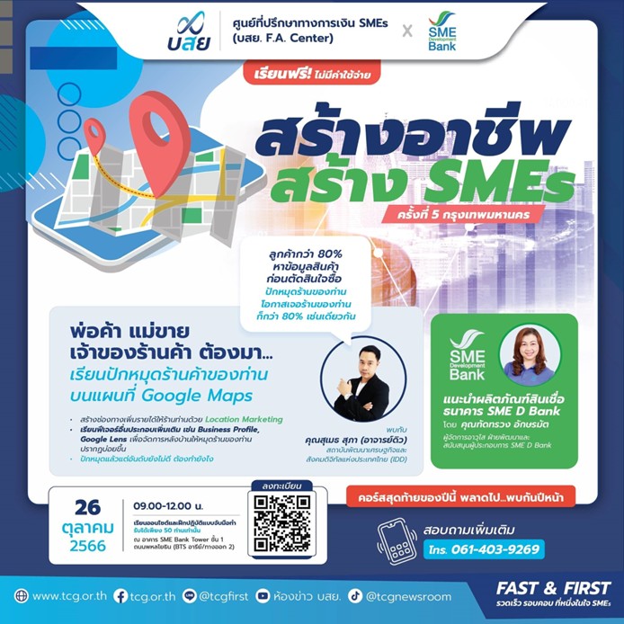 ธนาคารพัฒนาวิสาหกิจขนาดกลางและขนาดย่อม หรือ SME D Bank ร่วมกับ บรรษัทประกันสินเชื่ออุตสาหกรรมขนาดย่อม (บสย.) จัดอบรมฟรี ในกิจกรรม”สร้างอาชีพ สร้าง SMEs” ครั้งที่ 5 กรุงเทพมหานคร ติดปีกผู้ประกอบการเข้าสู่สมรภูมิการค้าด้วยการปักหมุดร้านค้าบนแผนที่ Google Maps ช่วยลูกค้าตัดสินใจสั่งซื้อได้อย่างรวดเร็ว สร้างช่องทางการค้าด้วย Location Marketing ปักหมุดแล้ว ทำอย่างไรให้ขึ้นฟีด สร้าง Business Profile, Google Lens การจัดการหลังบ้านให้เข้าตาลูกค้าได้บ่อย สนใจสมัครด่วน รับจำนวนจำกัดเพียง 50 ท่านเท่านั้น อบรมวันที่ 26 ตุลาคมที่จะถึงนี้ เวลา 09.00-12.00 น. ณ Co-working Space อาคาร SME Bank Tower ชั้น 1