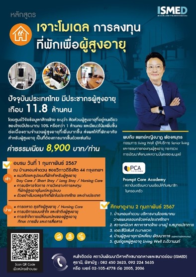 หลักสูตร “เจาะโมเดล การลงทุนในธุรกิจที่พักเพื่อผู้สูงอายุ” เป็นหลักสูตรที่ผู้สนใจจะได้เรียนรู้ทั้งในเชิงทฤษฎี และ ศึกษาดูงานจากสถานที่จริง รวมถึงร่วมวิเคราะห์เจาะลึกกับเจ้าของกิจการ ถึง 5 แห่ง 5 รูปแบบการลงทุน อุปสรรค ปัญหา เทคนิคต่าง ๆ ที่พร้อมจะเปิดเผยจากเจ้าของกิจการโดยตรง หลักสูตรจะจัดในวันที่ 1-2 กุมภาพันธ์ 2567 ค่าธรรมเนียม 8,900 บาท ต่อ 1 ท่าน (รวมอาหารและค่าเดินทาง)
