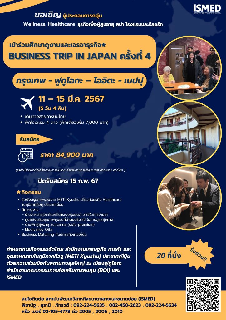 ที่ผ่านมา ISMED ได้จัดให้มี การศึกษาดูงานและเจรจาธุรกิจประสบผลสำเร็จมาแล้วในหลายเมือง โดยครั้งที่จะถึงนี้เป็นครั้งที่ 4 Business Trip in Japan กรุงเทพฯ - ฟูกูโอกะ - โออิตะ - เบปปุ ในวันที่ 11-15 มีนาคมที่จะถึงนี้ การศึกษาดูงานในครั้งนี้ เป็นความร่วมมือระหว่าง ISMED สถานกงสุลใหญ่ ณ เมืองฟูกูโอกะ และ สำนักงานคณะกรรมการส่งเสริมการลงทุน (BOI) โดย METI Kyushu เป็นผู้จัดทำกำหนดการการศึกษา ดูงานและจัดกิจกรรมเจรจาธุรกิจให้กับผู้ประกอบการด้วย