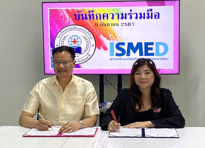 9 กันยายน 2567 นายพิตรพิบูล ธีร์จันทึก ผู้อำนวยการ สถาบันพัฒนาวิสาหกิจขนาดกลางและขนาดย่อม (ISMED) ร่วมลงนามกับ นางสาวนุจรินทร์ กั้วพิสมัย ผู้บริหาร โรงเรียนปทุมอินเตอร์บริรักษ์ สถานศึกษาวิชาชีพเฉพาะในเครือมหาวิทยาลัยปทุมธานี ในการสนับสนุนวิชาชีพการบริบาลผู้สูงอายุ หลักสูตรวิชาการดูแลผู้สูงอายุ ด้วยการจัดหาผู้มีใจรักในอาชีพด้านการบริบาล ประสานหาทุนการศึกษาเพื่อให้ผู้เรียนได้เข้าถึงการศึกษาด้านอาชีพที่ต้องการ ตลอดจนประชาสัมพันธ์ เผยแพร่ข้อมูลข่าวสาร ผ่านช่องทางการสื่อสารทั้งออนไลน์ และออฟไลน์ของ ISMED ทั้งนี้ เพื่อส่งเสริมวิชาชีพด้านการบริบาล ซึ่งบุคคลากรในวิชาชีพนี้ยังผลิตออกมาไม่เพียงพอต่อความต้องการของจำนวนผู้สูงอายุที่เพิ่มจำนวนมากขึ้นในแต่ละปี