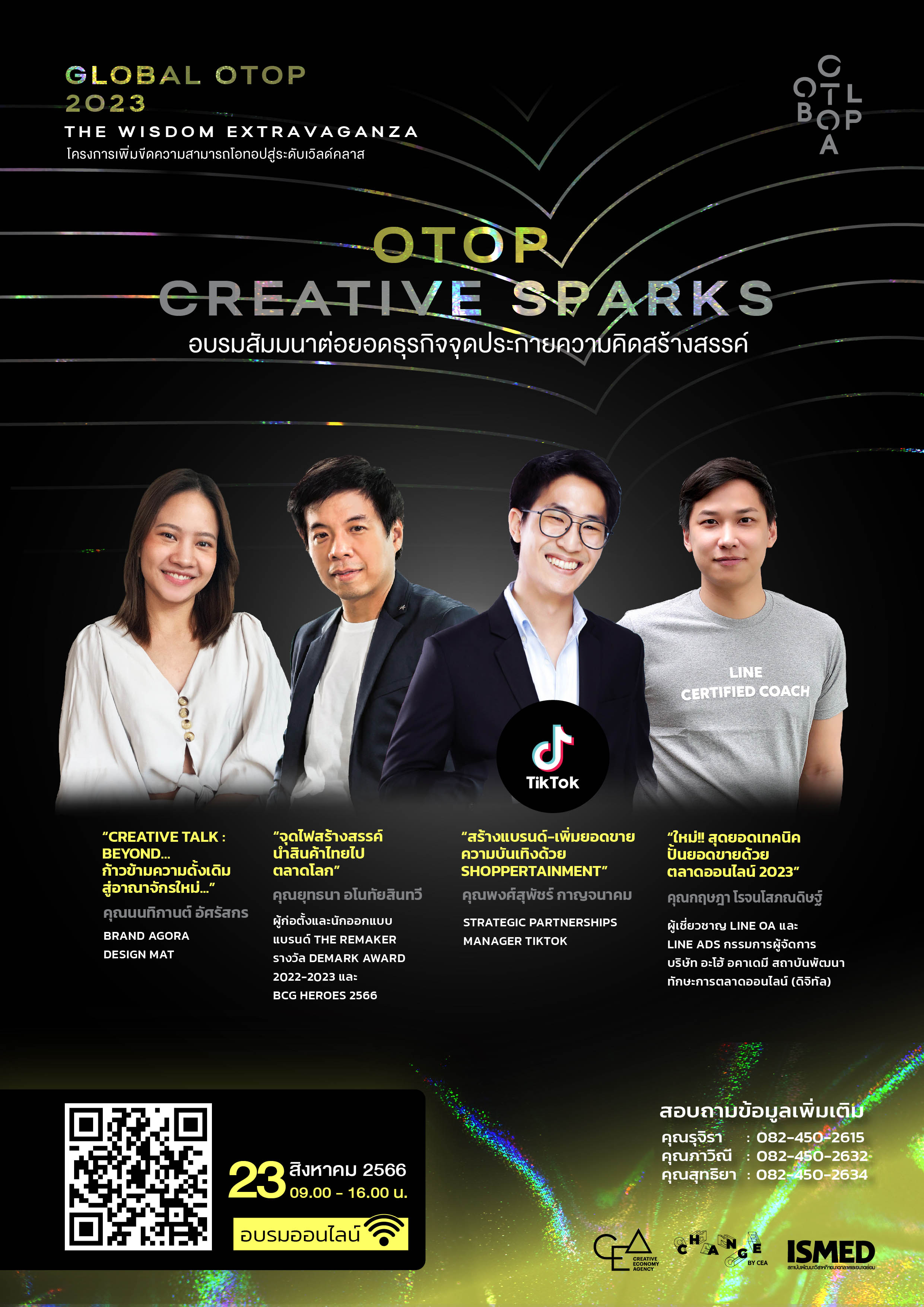 ซึ่งเป็นหนึ่งในกิจกรรมหลักของ GLOBAL OTOP 2023: THE WISDOM EXTRAVAGANZA โครงการเพิ่มขีดความสามารถโอทอปสู่ระดับเวิลด์คลาส สำนักงานส่งเสริมเศรษฐกิจสร้างสรรค์ (องค์การมหาชน) หรือ CEA OTOP Creative Sparks BIG SEMINAR DAY