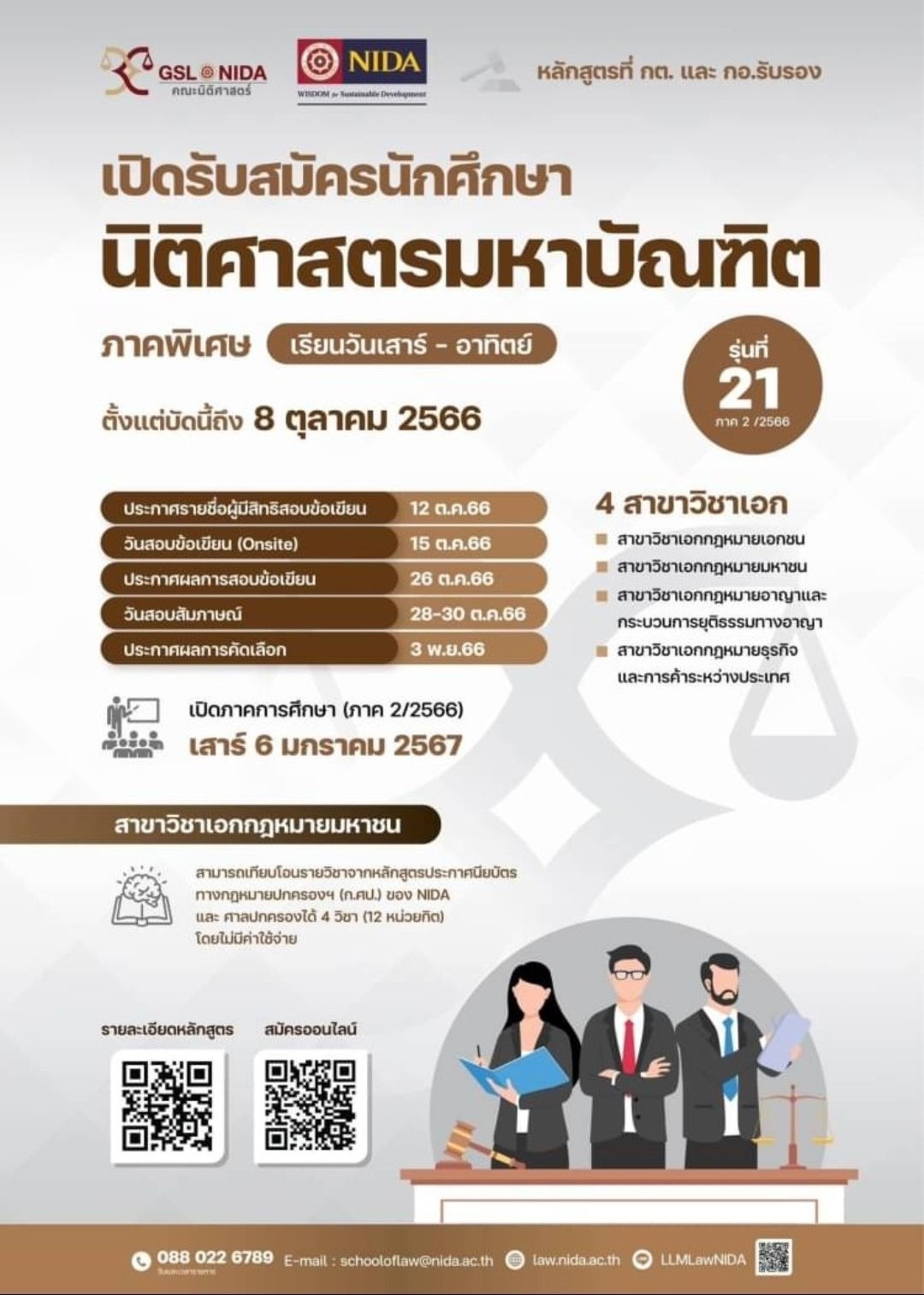 คณะนิติศาสตร์ สถาบันบัณฑิตพัฒนบริหารศาสตร์ (NIDA) เปิดรับสมัครนักศึกษาหลักสูตรนิติศาสตร์มหาบัณฑิต (ภาคพิเศษ) รุ่นที่ 21 (เรียนวันเสาร์-วันอาทิตย์) ประจำภาคการศึกษาที่ 2 ปีการศึกษา 2566 รับสมัครตั้งแต่วันนี้ ถึงวันที่ 8 ตุลาคม 2566 เปิดสอน 4 สาขาวิชา ได้แก่ สาขาวิชาเอกกฎหมายเอกชน สาขาวิชาเอกกฎหมายมหาชน สาขาวิชาเอกกฎหมายอาญาและกระบวนการยุติธรรมทางอาญา และสาขาวิชาเอกกฎหมายธุรกิจและการค้าระหว่างประเทศ