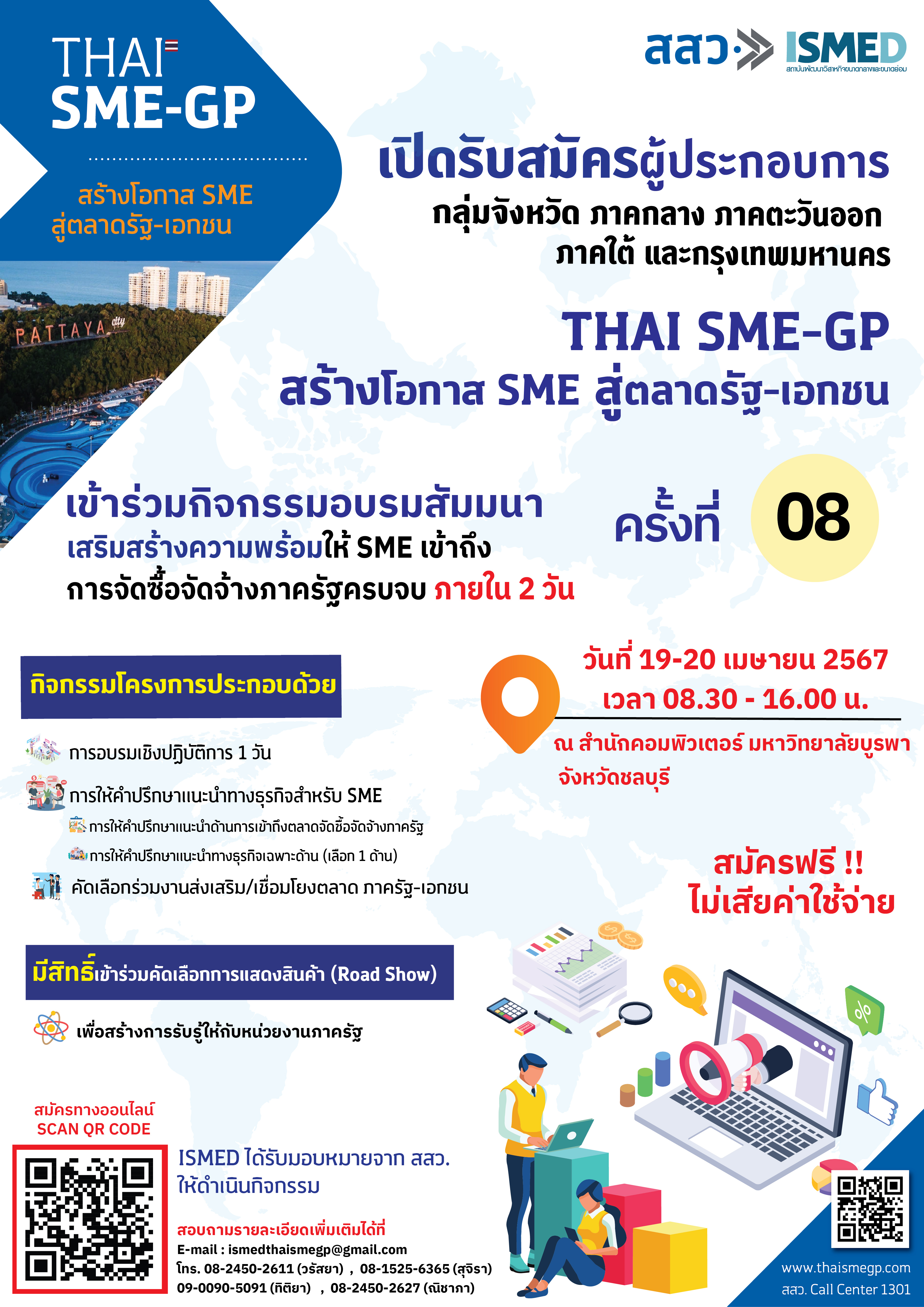 สำนักงานส่งเสริมวิสาหกิจขนาดกลางและขนาดย่อม (สสว.) มอบหมายให้สถาบันพัฒนา SMEs หรือ ISMED ดำเนิน โครงการ THAI SME-GP สร้างโอกาส SME สู่ตลาดรับ-เอกชน เพื่อส่งเสริมผู้ประกอบการให้เกิดความพร้อม และเพิ่มโอกาสทางการตลาดเข้าถึงการจัดซื้อจัดจ้างภาครัฐ ภาคเอกชนเบ็ดเสร็จภายใน 2 วัน โอกาสดี ๆ ฟรีไม่มีค่าใช้จ่าย