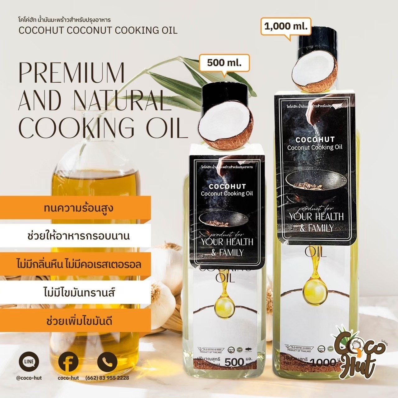 น้ำมันมะพร้าวสกัดเย็น สำหรับทำอาหาร ผลิตจากมะพร้าวอินทรีย์ ได้รับการรับรองมาตรฐานการผลิตและมีเลขจดแจ้ง อย.